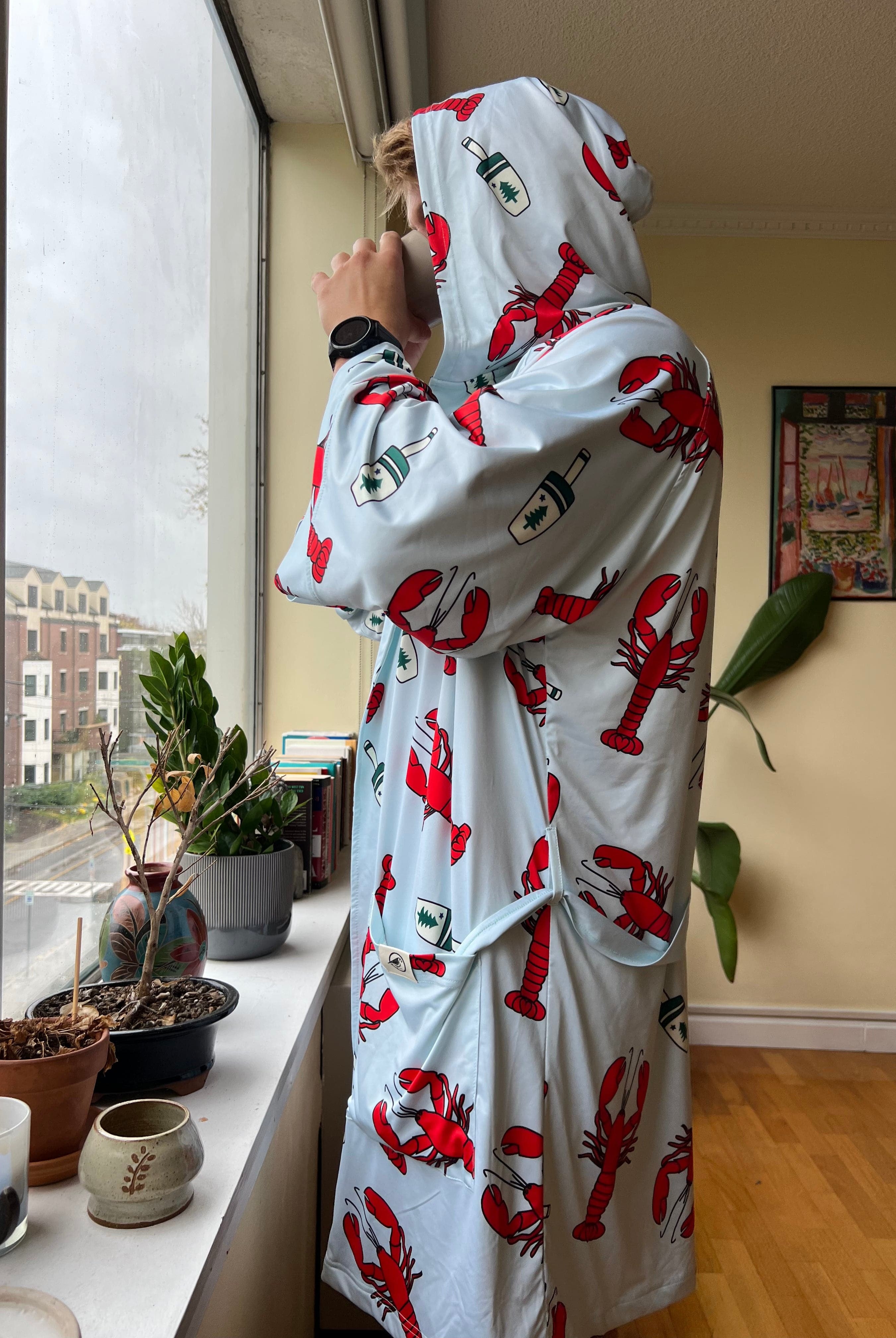 Our Lounge AnyWear Robe is like the Range Rover of robes – bold, sleek, and ready for any terrain, whether it's lounging at home or making a quick coffee run. It comes equipped with spacious front pockets, perfect for stashing your remote or a secret snack, and a hidden inner pocket to keep your phone or other top-secret items safe. The removable belt, supported by belt loops, ensures a snug fit, while the large hood offers excellent sun protection and a touch of mystery.